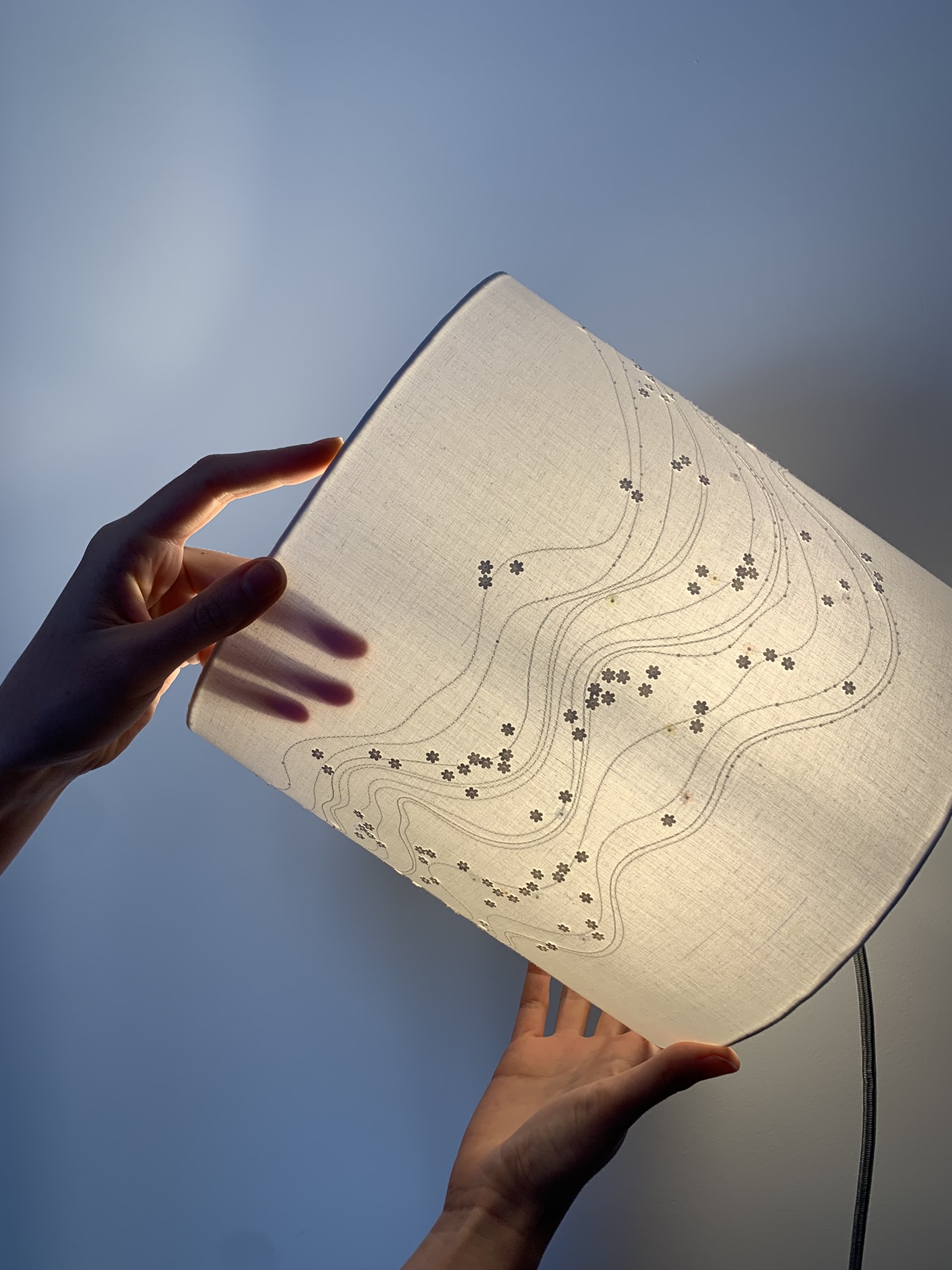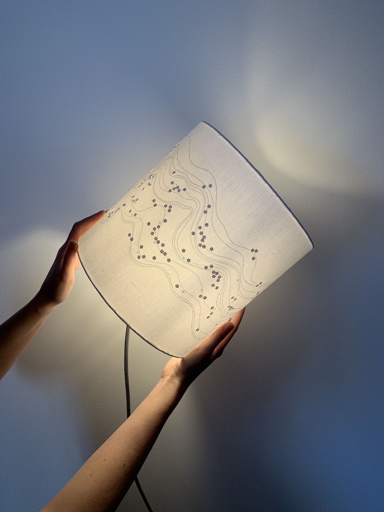 Éteint, on entrevoit la brillance des matières qui accrochent la lumière extérieure. Allumé, l’abat-jour laisse apparaître le graphisme des lignes et une mousse délicate de paillettes en forme de fleurs.