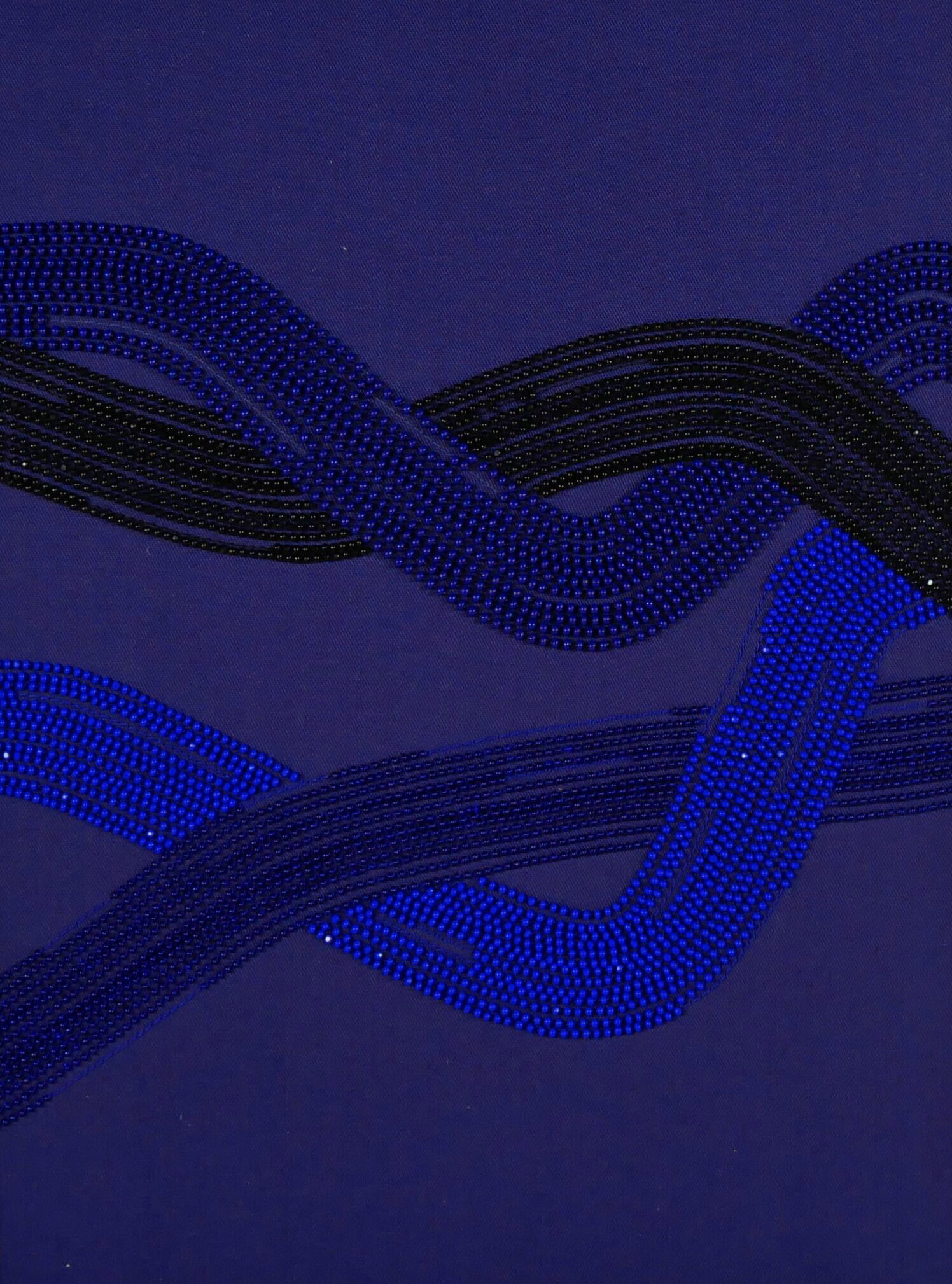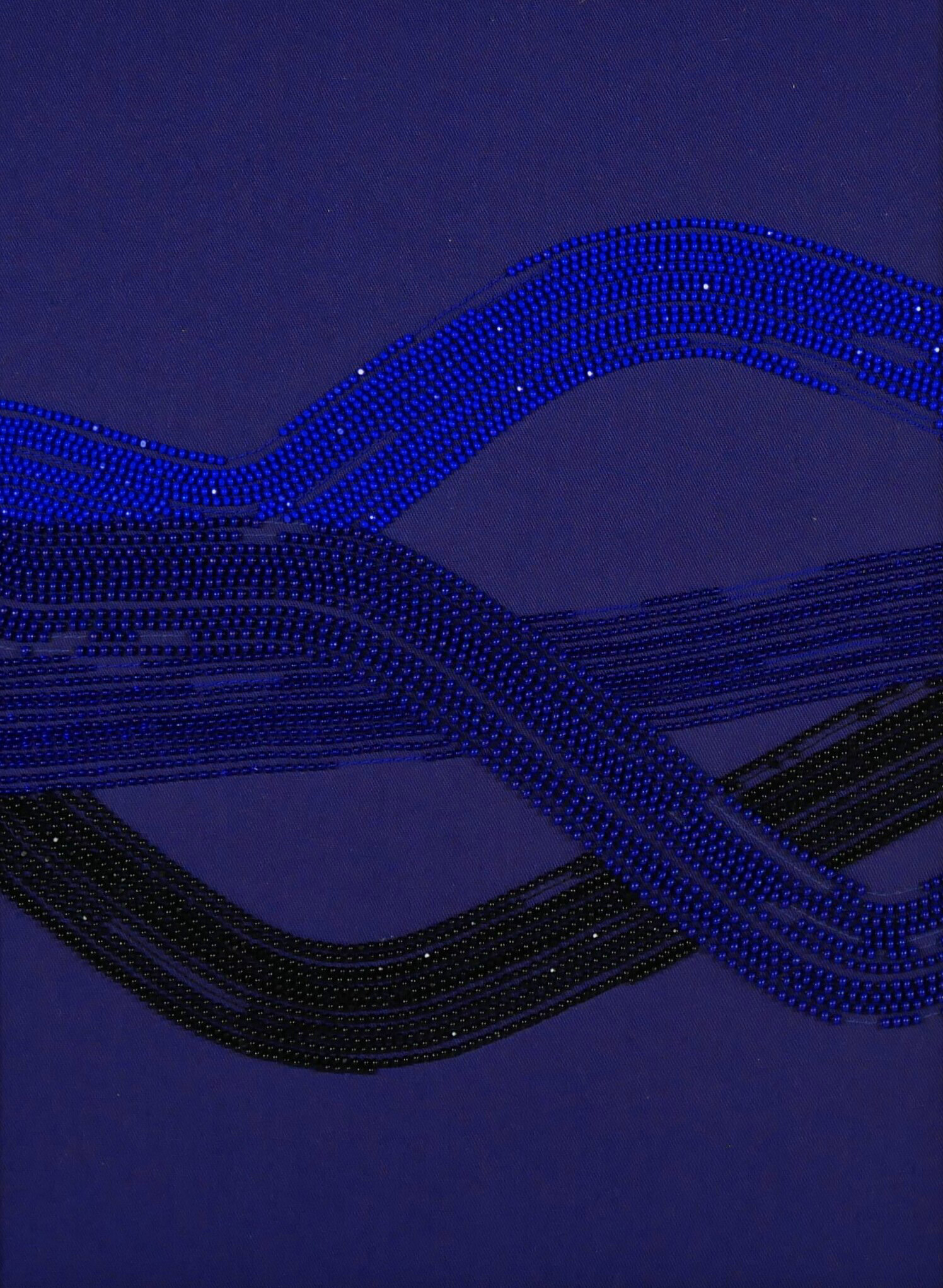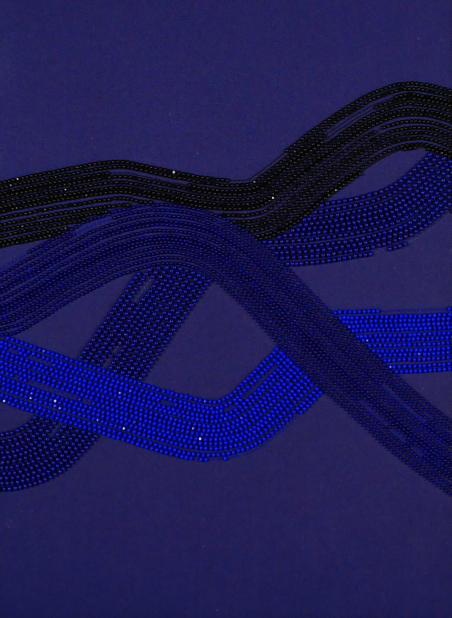 Des lignes qui s’entrelacent, dans une composition de bleus profonds et lumineux, et de noir.