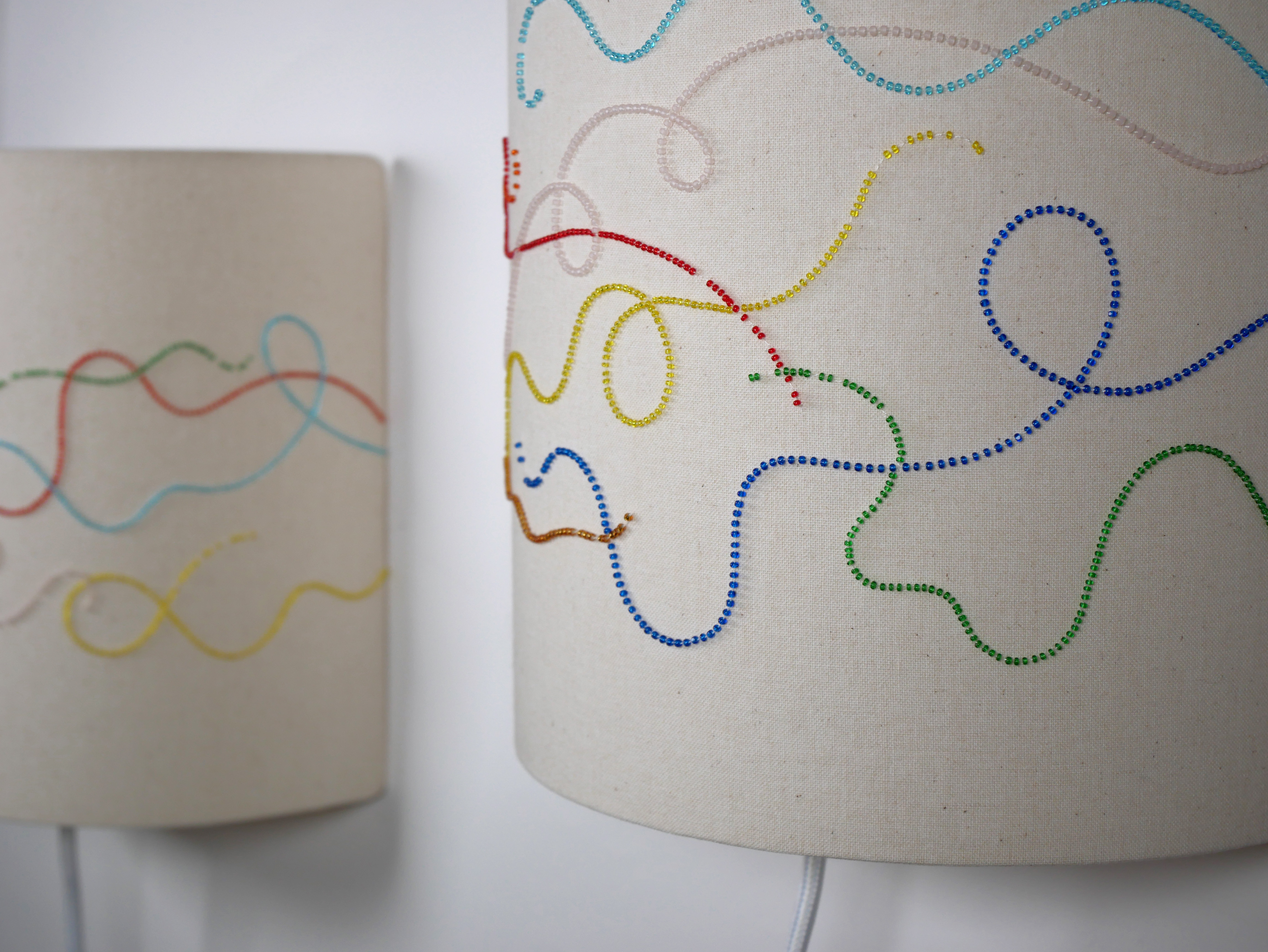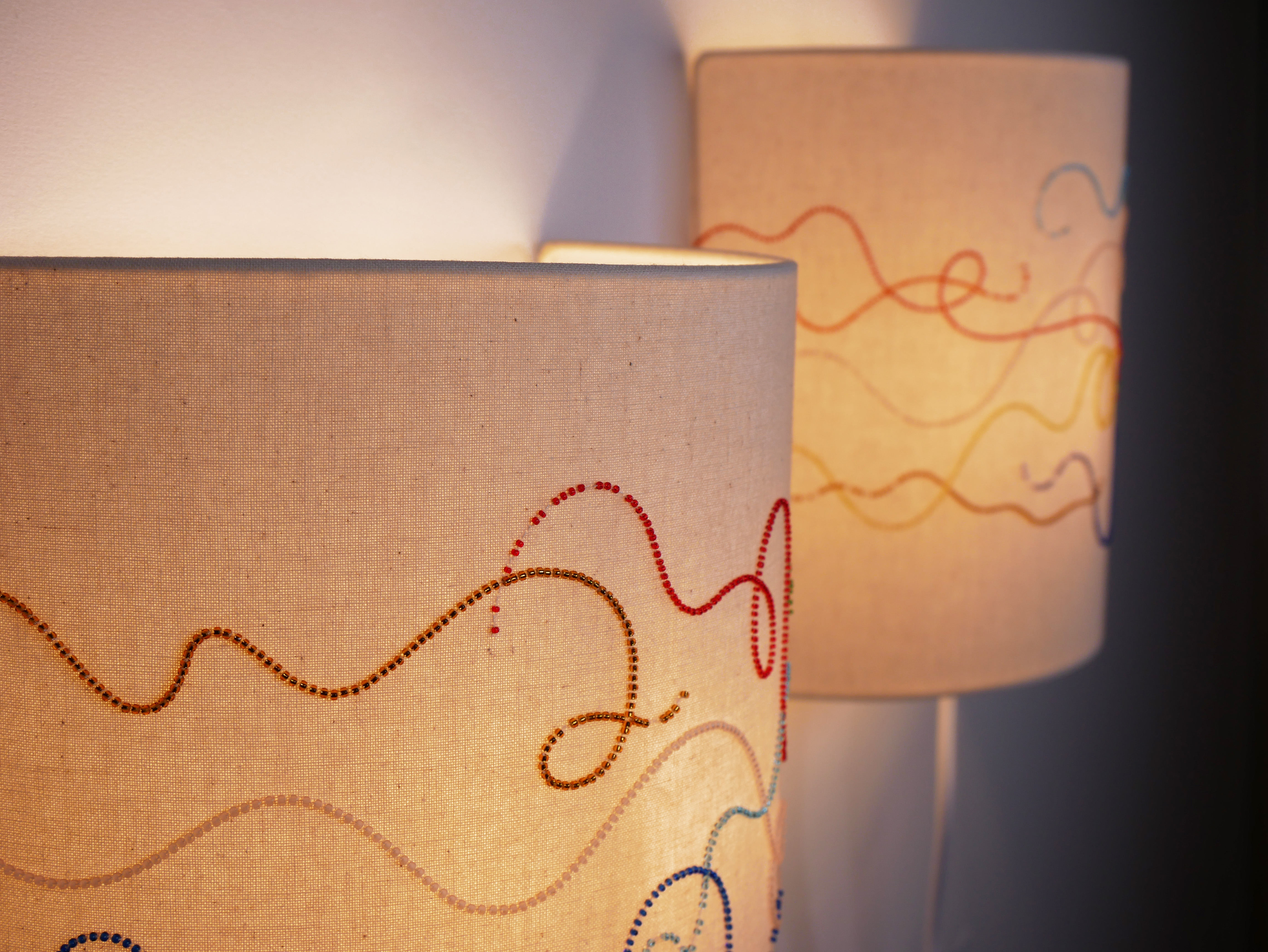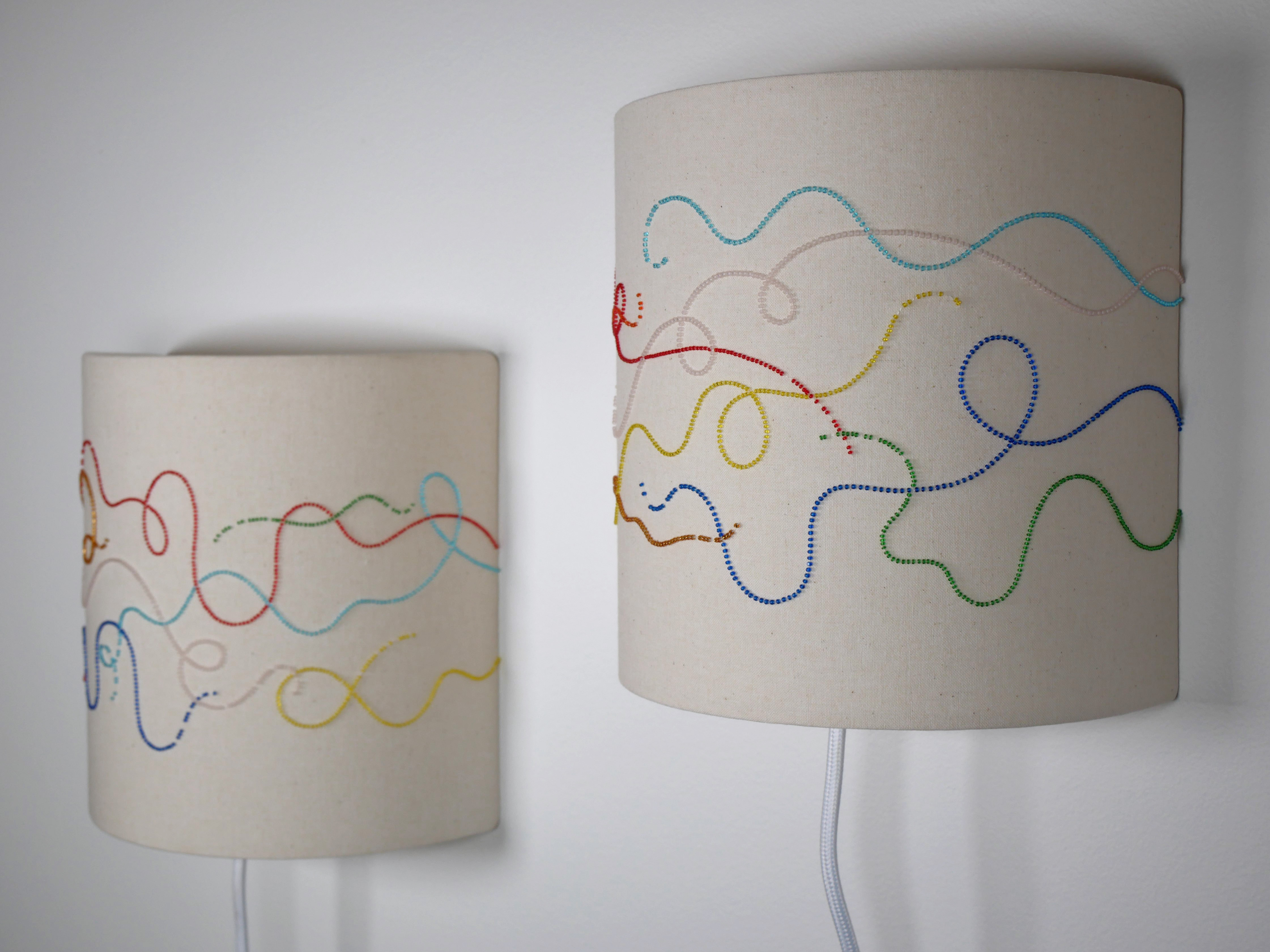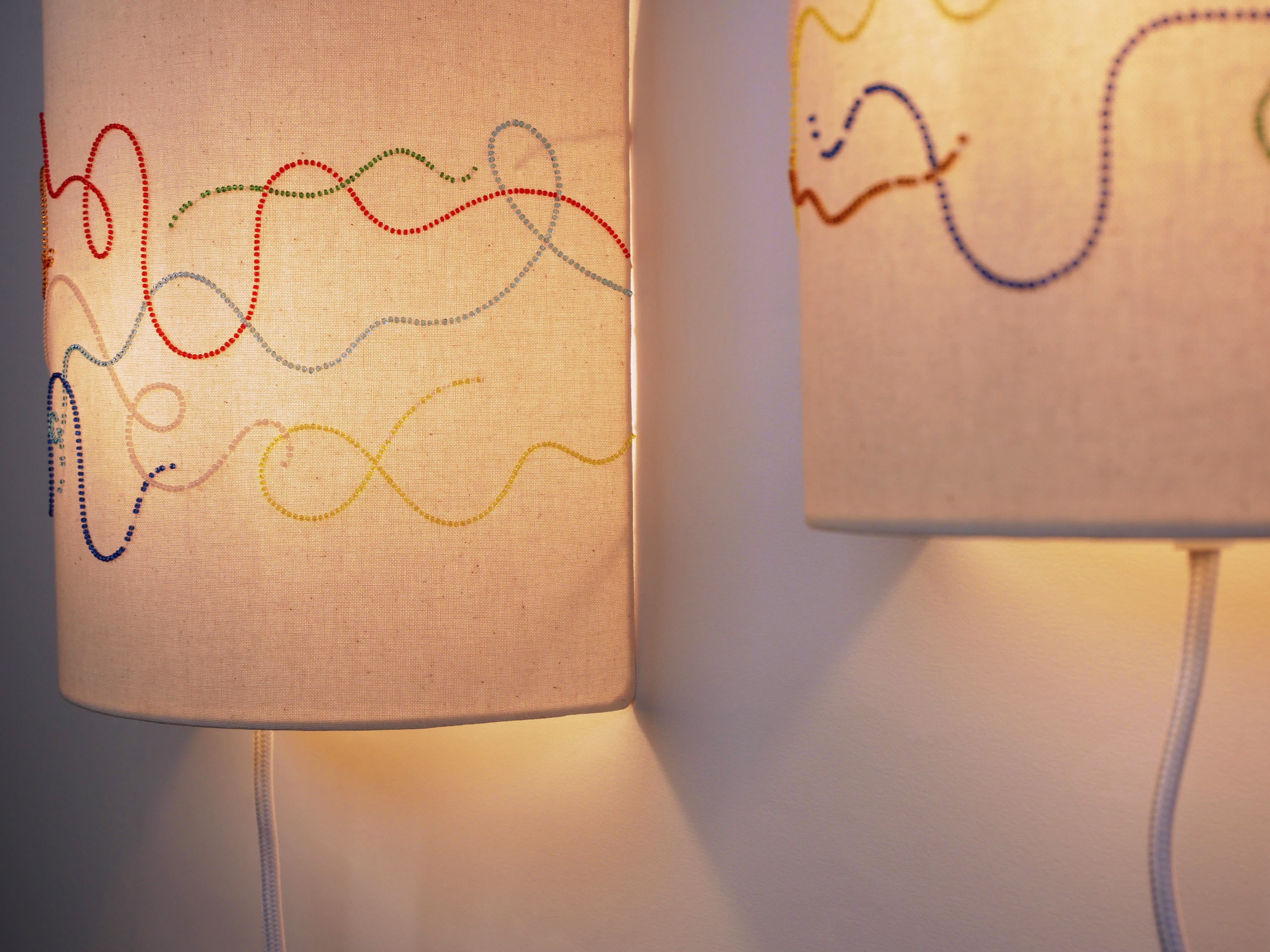 Éteintes, on entrevoit la brillance des matières qui accrochent la lumière extérieure. Allumées, les appliques laissent apparaître le graphisme des lignes en dégageant une lumière chaude.
