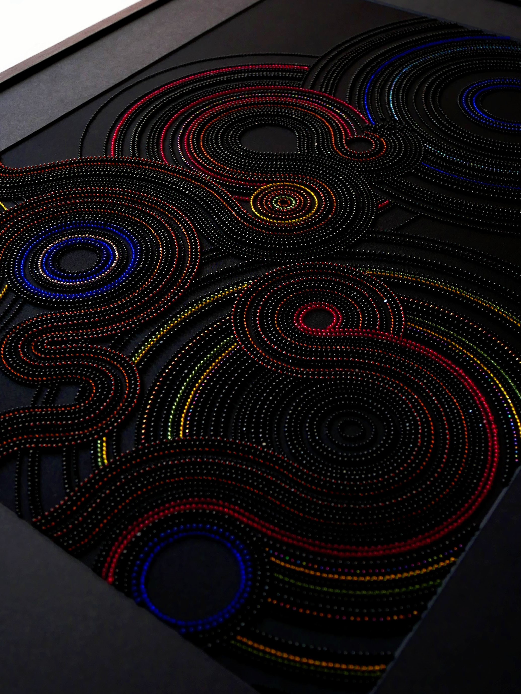 Broderie de micro-perles dans des tons de bleus, verts, grenat et noir sur pongé de soie noir.