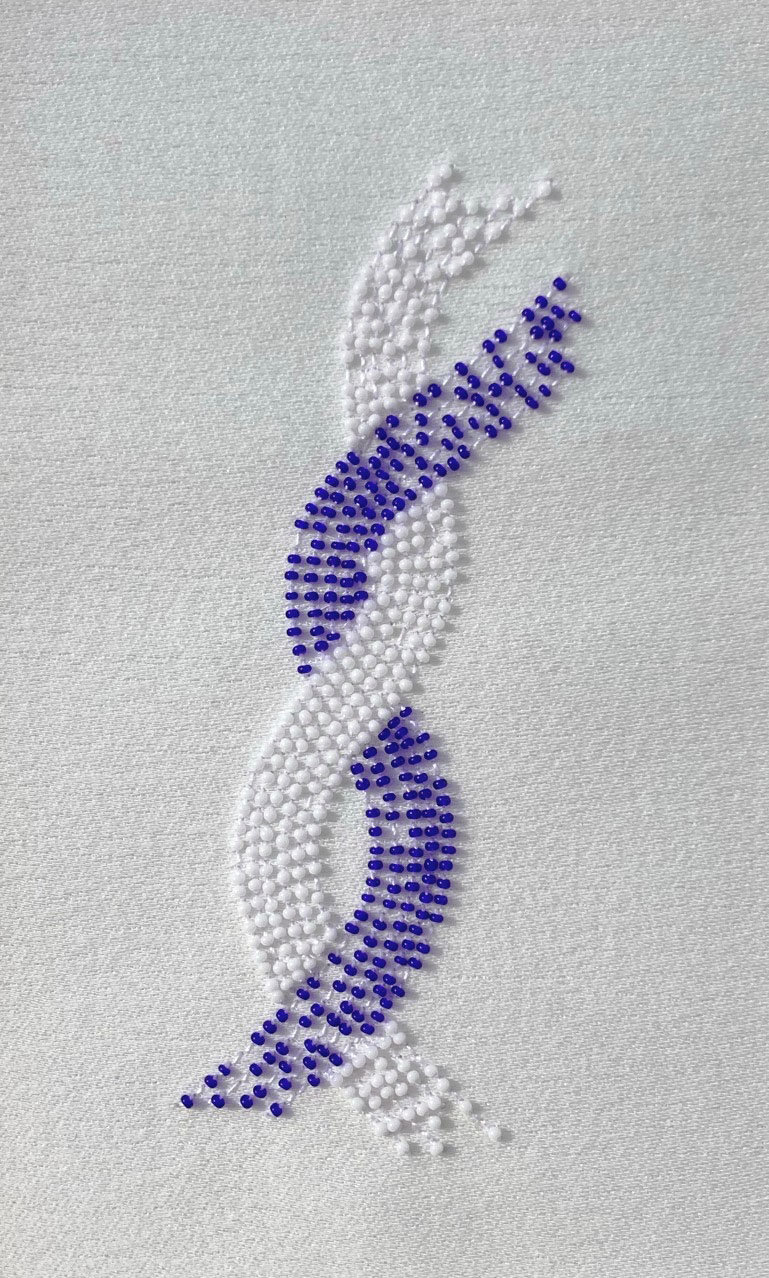 Broderie perlée de micro-perles bleues et blanches, fil blanc sur crêpe de soie écrue.