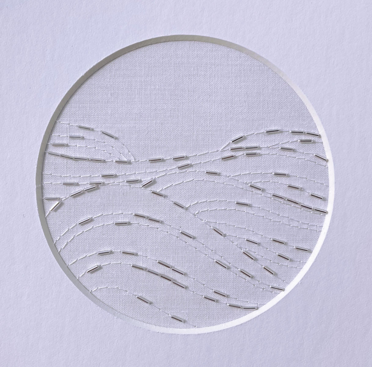 Broderie de micro-tubes argent, fil blanc sur toile de coton blanc.
