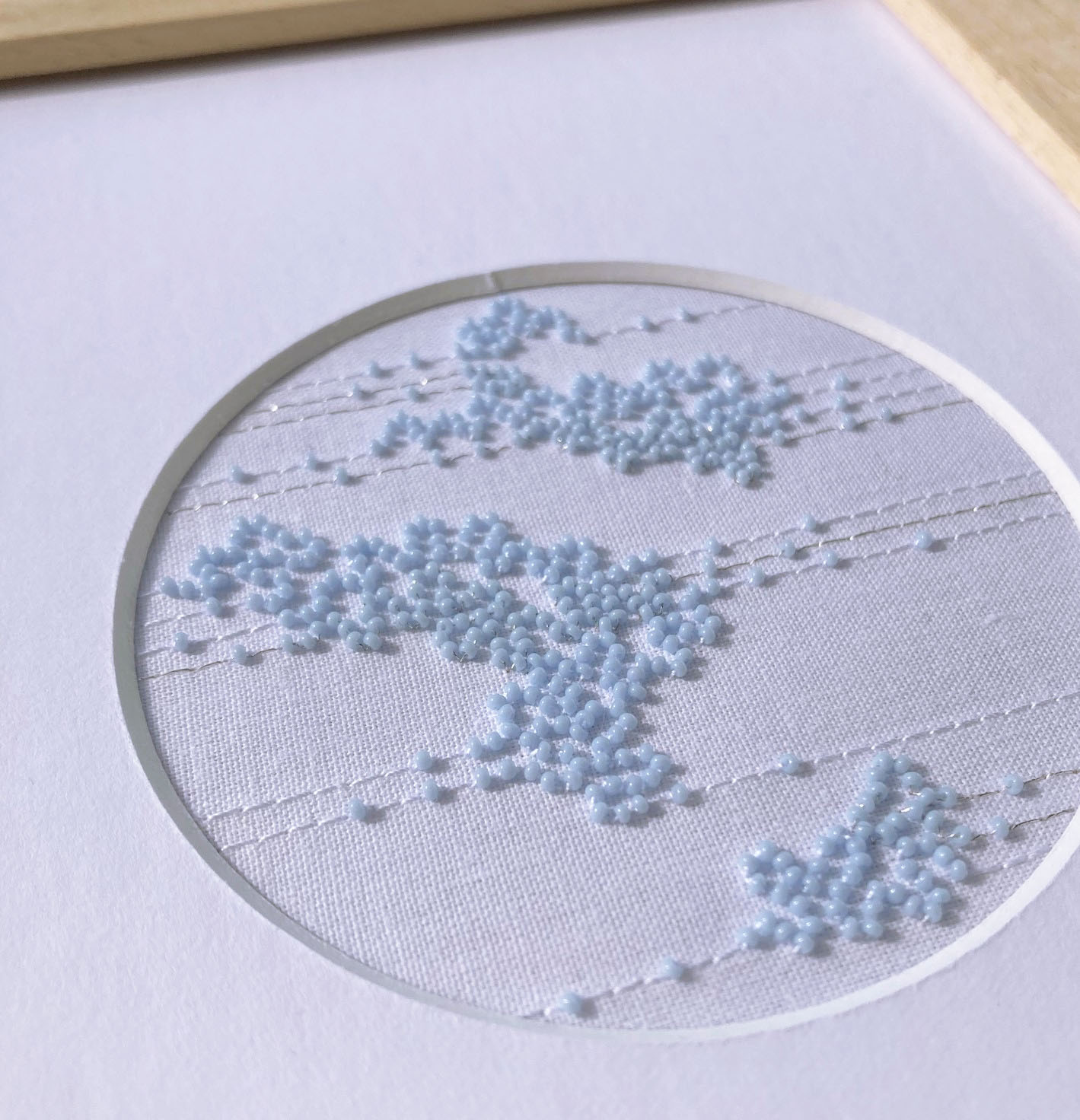 Broderie perlée bleue, fils blanc et argent sur toile de coton blanc.