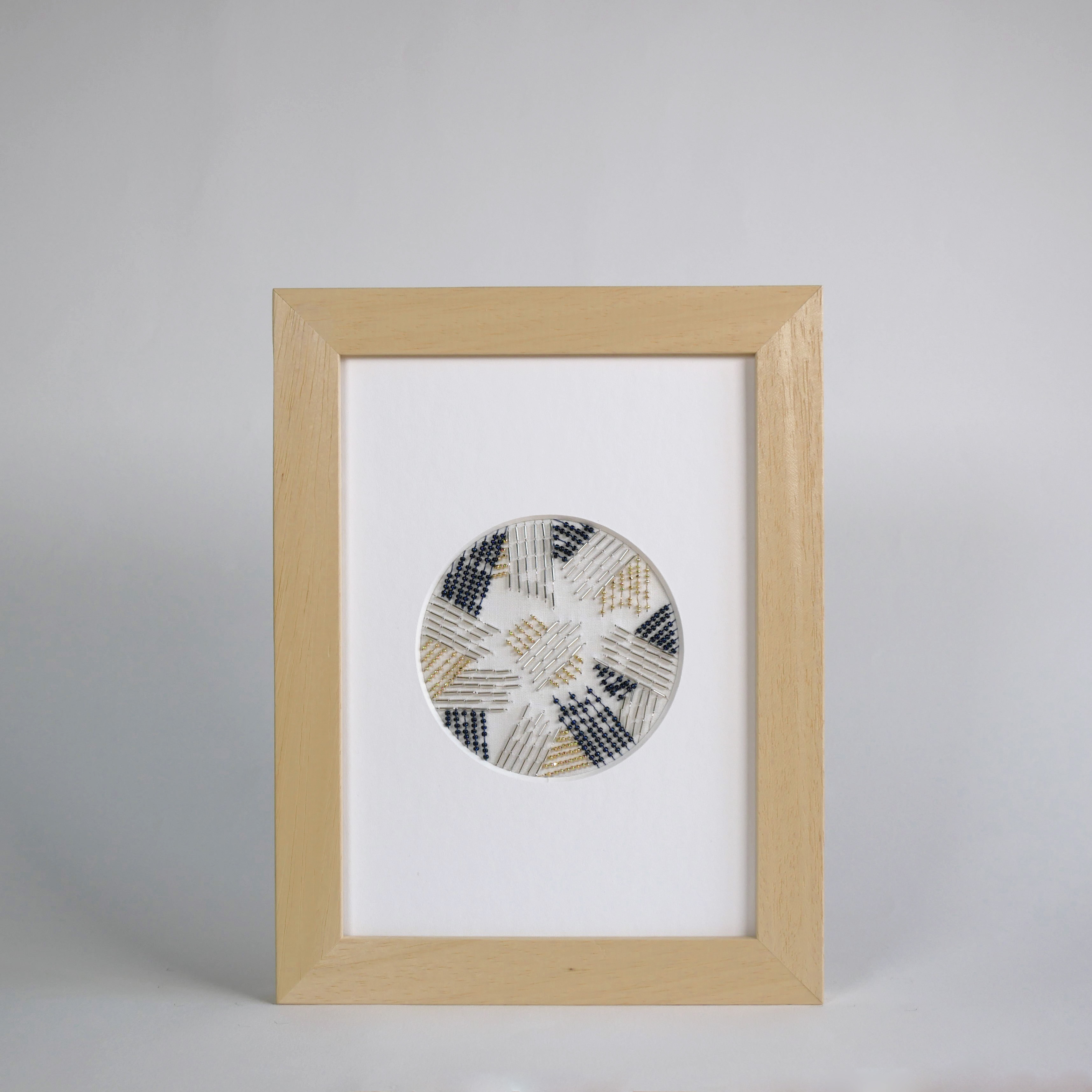 Broderie perlée bleu profond, plaqué or 24 carats et argent, fils bleu, or et argent, sur toile de coton blanche.